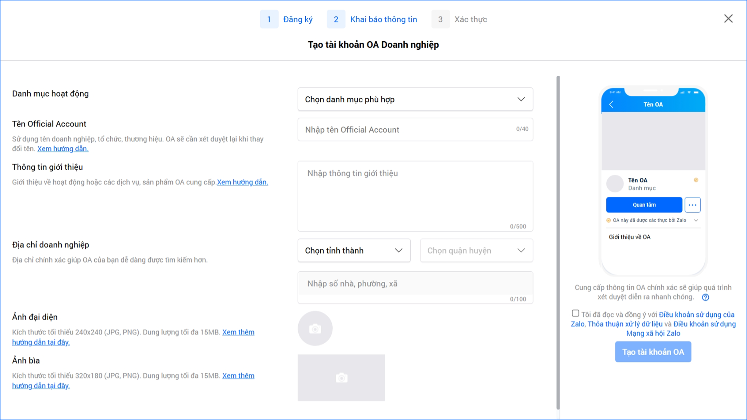 Bước 3: Tiến hành tạo tài khoản OA Doanh nghiệp bằng cách điền các thông tin