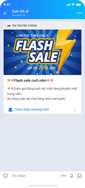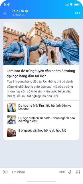 • Đa dạng công cụ gửi tin: thông qua OA Manager (bản web và bản Mini App), thông qua OA OpenAPI hoặc thông qua các phần mềm của bên thứ ba đã tích hợp với hệ thống Zalo OA.